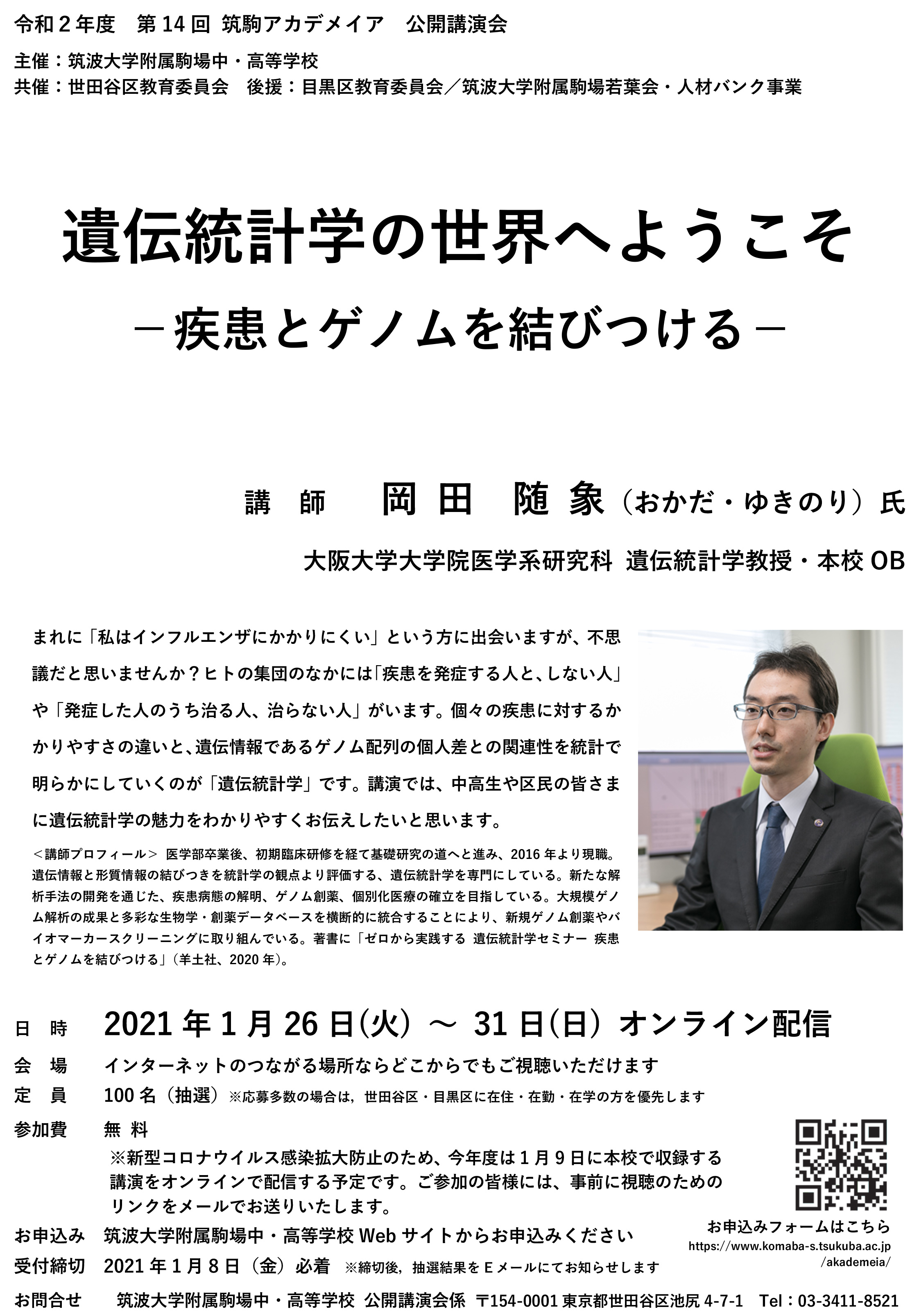 この事業は、緑豊かな駒場を舞台に筑波大学・生徒・教員・卒業生(若葉会筑駒人材バンク)による「学ぶ喜びの体験」を目指し、開設されました。公開講演会では、地域の方を対象に、例えば医療や社会情勢など、ニーズの高い内容についての最新情報を、その分野の専門家が講演しています。