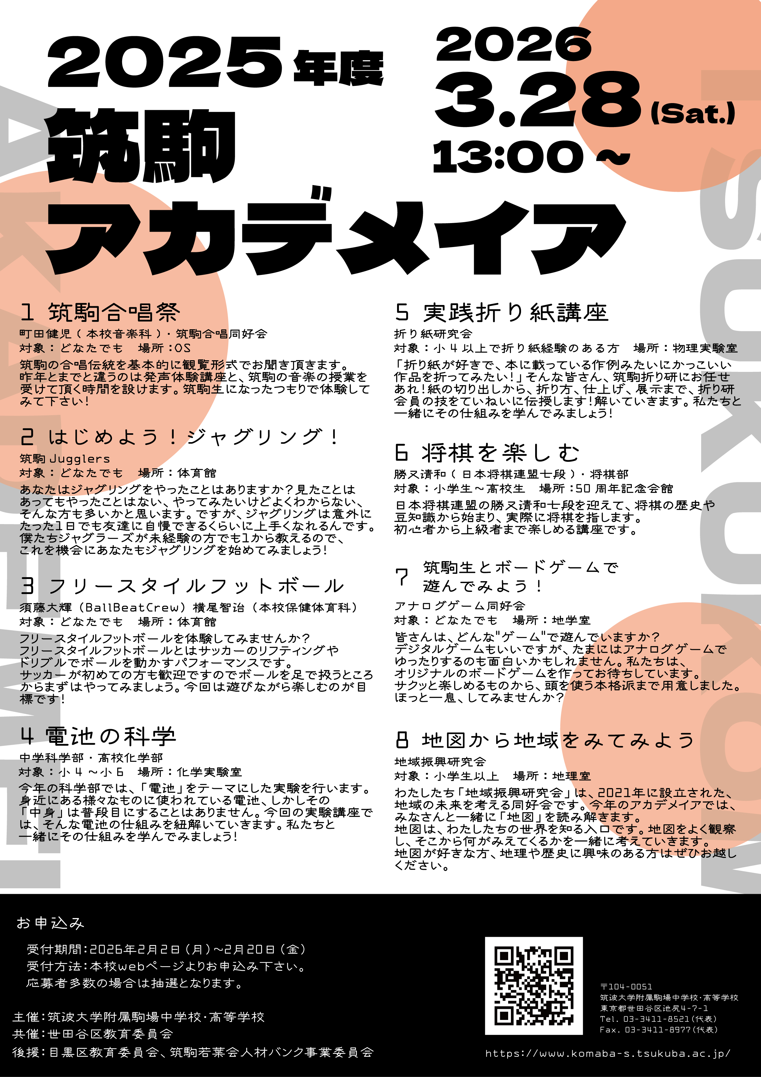 本校では、2007年度より世田谷区との共催、2008年度からは目黒区の後援も加わり「筑駒アカデメイア」として年2回の公開講演会と年1回の公開講座を開催しています。
