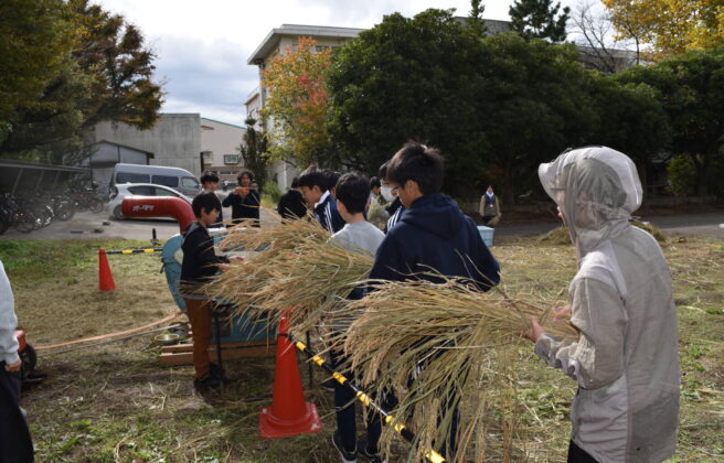 高校水田委員による防鳥ネット張りと農芸部による稲刈り