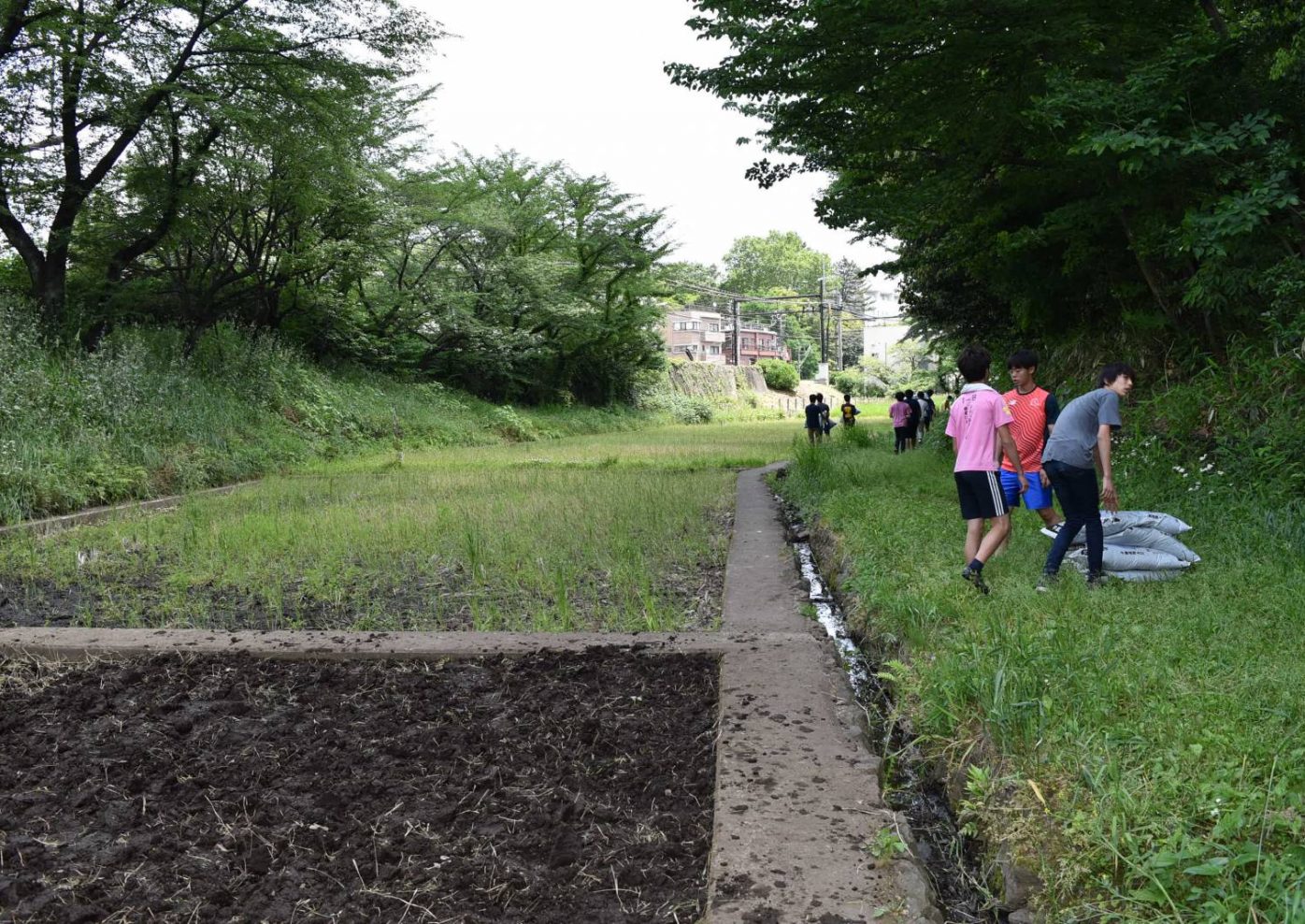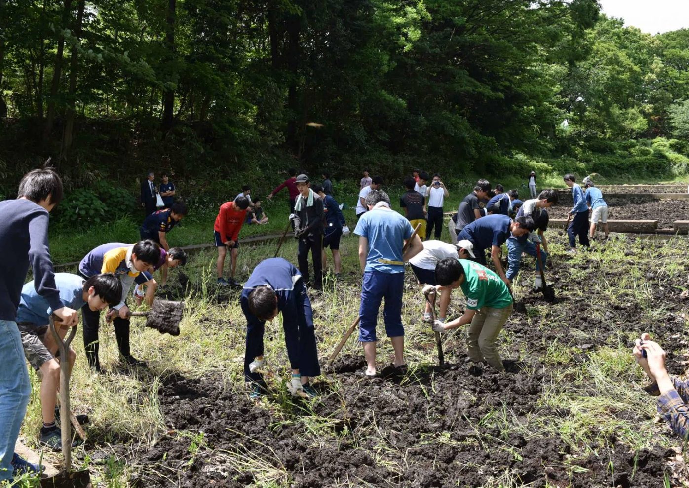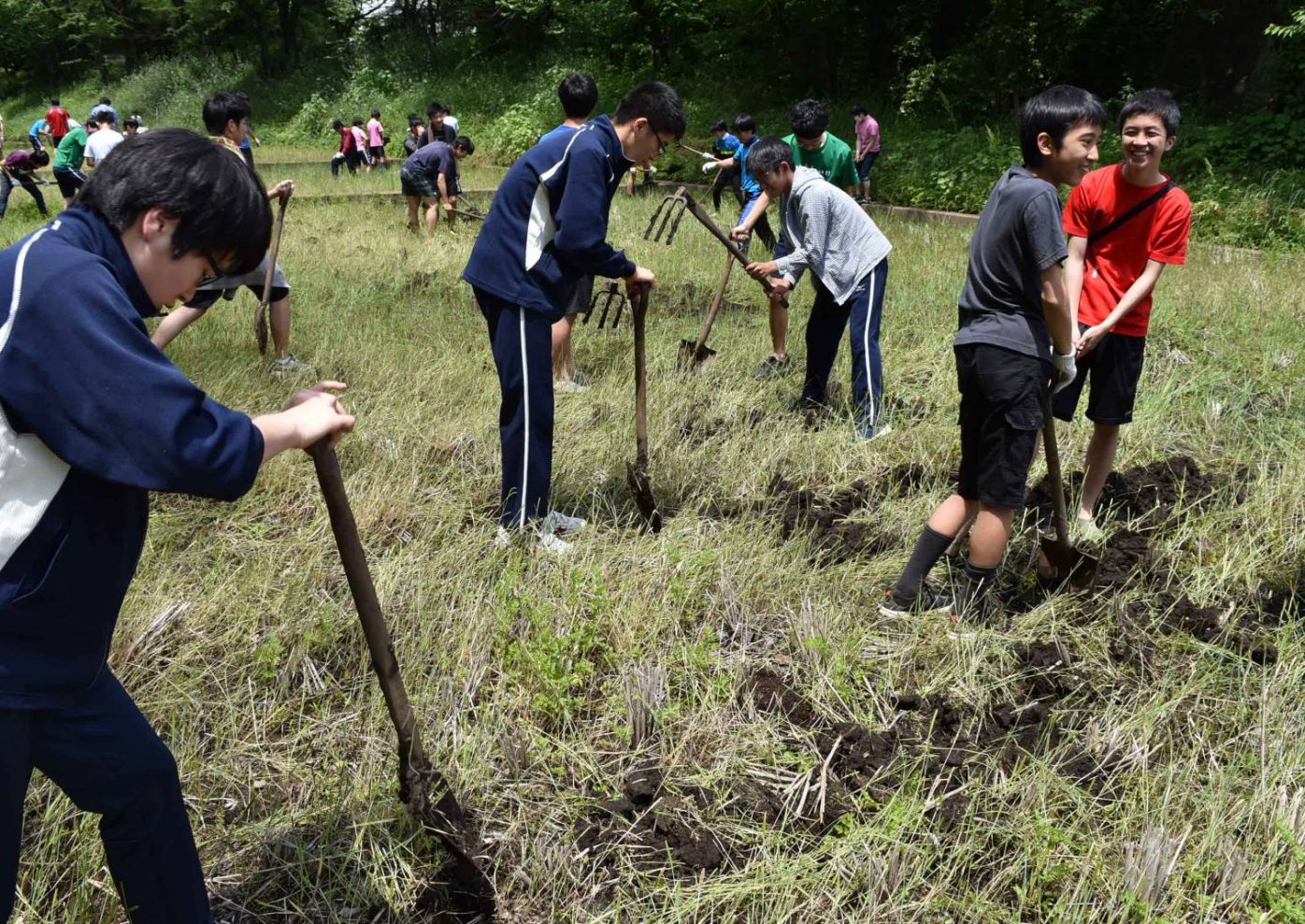 本日,総合学習の一環である「水田学習」において,中1と高1全員でケルネル田圃の耕起を行いました。唯一の肥料である牛糞をまき,スコップや鋤で耕します。3週間前に播種したイネは立派な苗になってきました。