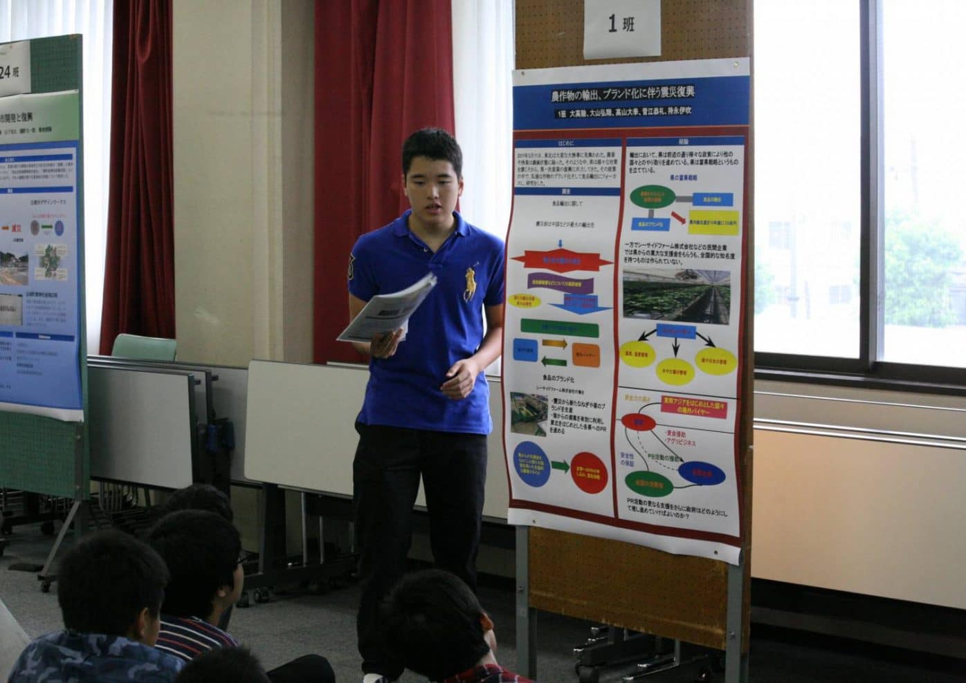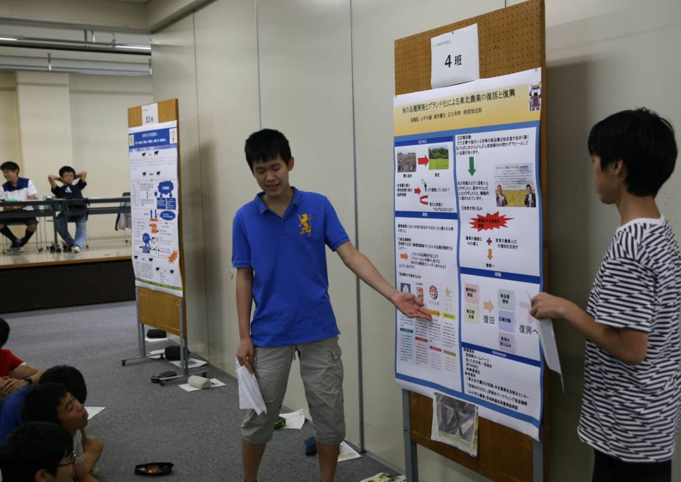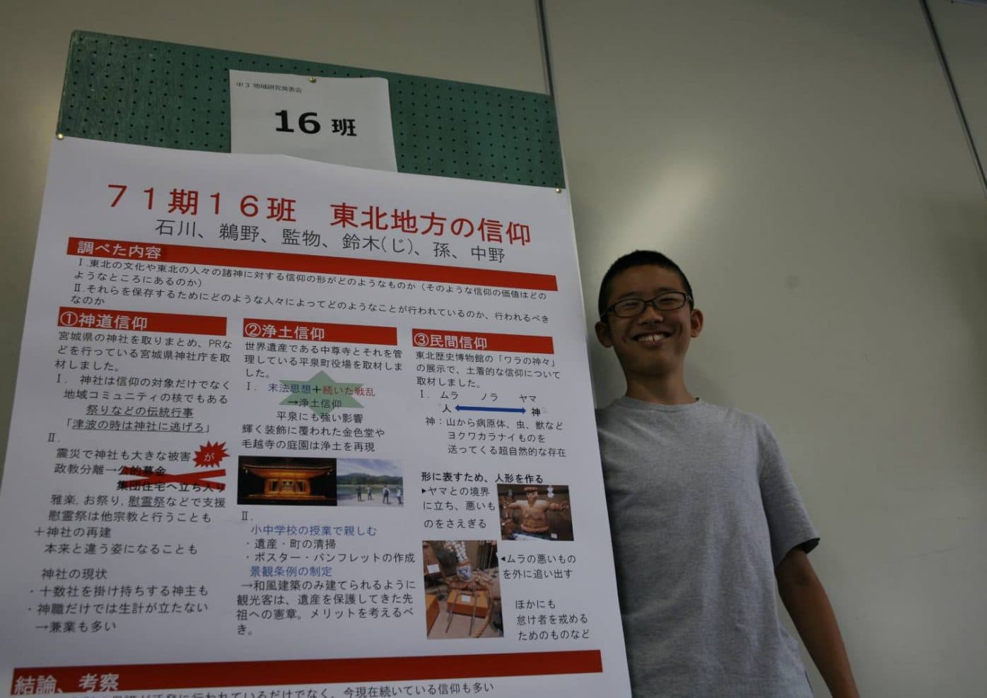 7月11日(木)と12日(金)に中学校3年生が東北地域研究報告発表会を開催しました。5月に学年を24班に分けて行われた地域研究の報告です。 ポスター作製、ポスター発表内容の検討、報告書作りと学習を進めていきました。 写真は発表の様子とこの地域研究を企画運営した校外学習委員の集合写真です。