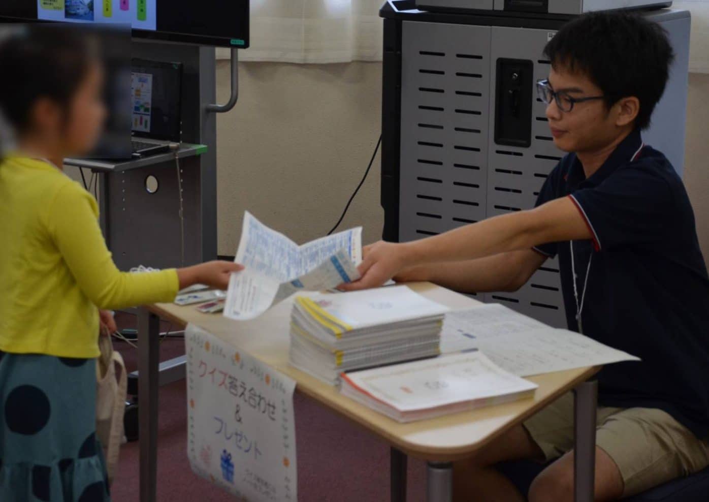 図書メディア委員会は今年も「東京・学校図書館スタンプラリー」に参加しています。2019年7月25日(木)には、本校図書スペースでもスタンプラリーが開催されました。3時間の開館時間にもかかわらず、校外から36名の方がお見えになりました。会場では、委員作の図書館クイズに挑戦していただきながら、蔵書や掲示物、館内の学習スペースをご覧いただきました。今回は司書の加藤先生・岡崎先生のご尽力で、文芸部誌特別展示とパズル同好会による新作問題の出題、過去の地域研究発表ポスターの投影、2011年度の「図書館デザインコンテスト」まとめ動画の上映なども行われました。来客のみなさんから寄せられた様々な質問を通して、委員たちは自分たちの活動の意義を再確認するよい機会となりました。