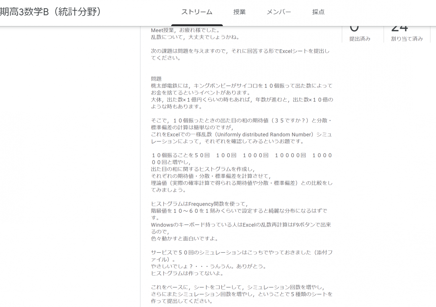数学Bの統計の授業では,Excelでの演習が中心となるので,この休校期間でもclassroomを使い課題の配布や回収を実施することができています。実際のclassroomでの課題提示と提出された課題を写真にしています。ここでは一様乱数を使った確率分布についてのシミュレーションをテーマにしています。一様乱数についてはMeetを使った授業でレクチャーをしました。普段の授業では演習に時間をかけられないところではありますが,自宅でじっくりと課題に取り組める期間なので,このような少し多い試行回数のシミュレーションも可能です。100万回のシミュレーションにチャレンジした生徒もいました。