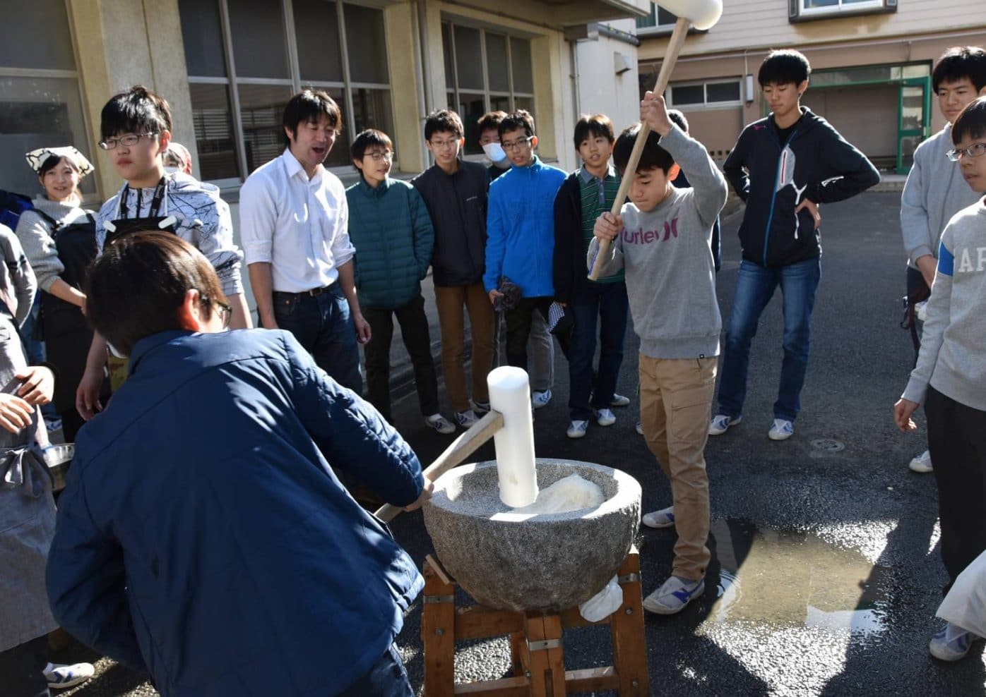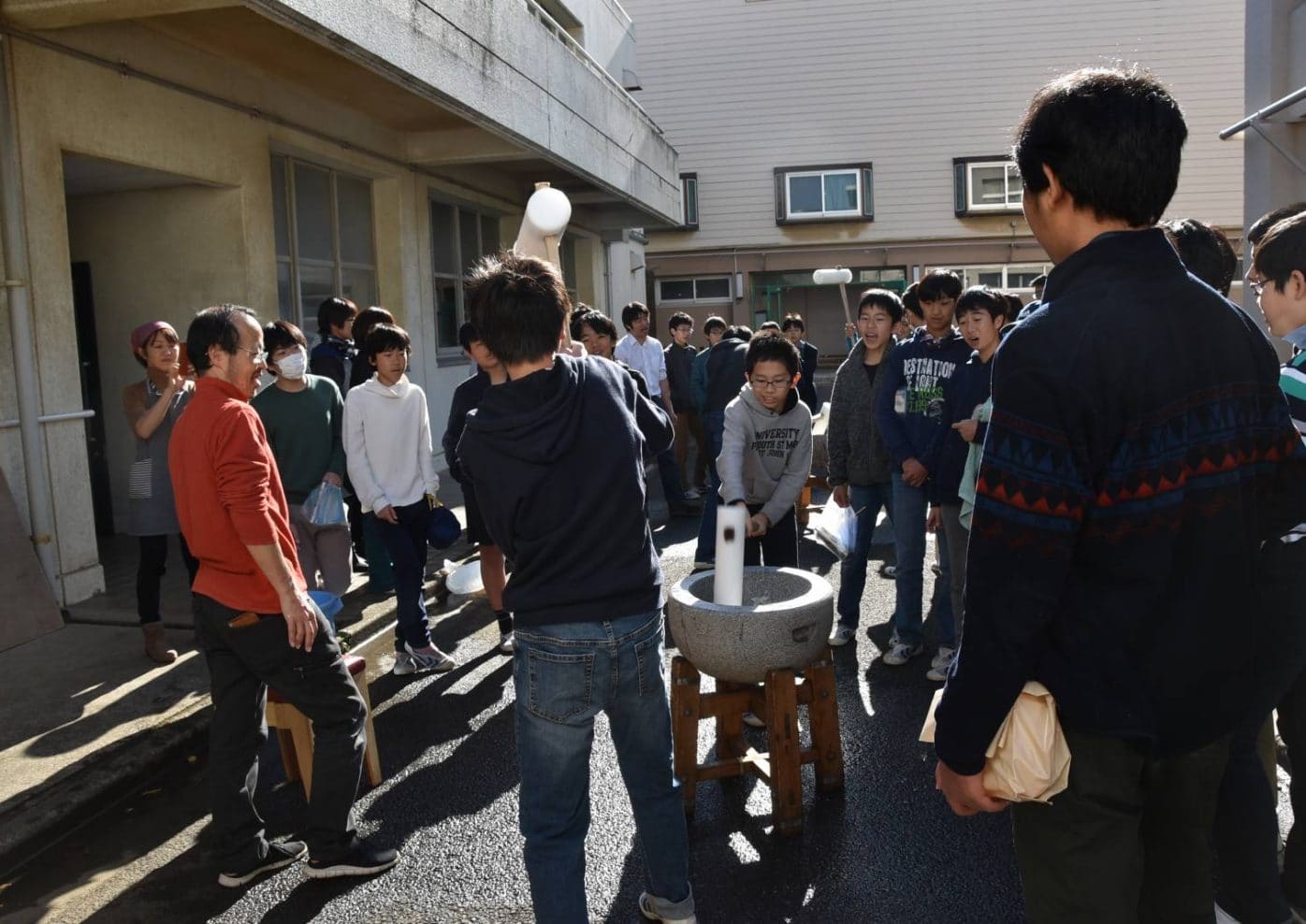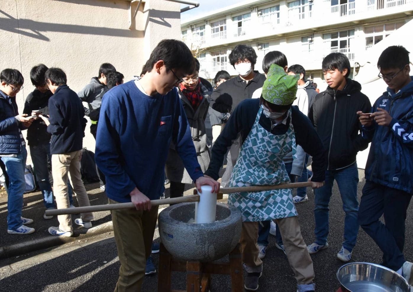中1と高1が春から行なってきた水田学習で収穫したお米で、毎年恒例の餅つきを行いました。保護者の皆様にお手伝いいただき、美味しいつきたてのお餅をお腹いっぱいいただきました。