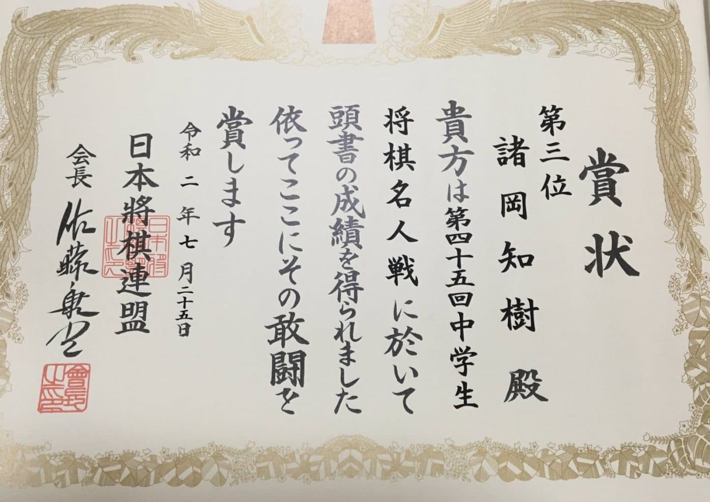 7/24~25に行われた日本将棋連盟主催第45回中学生将棋名人戦において中3A組諸岡知樹君が3位入賞を果たしました。