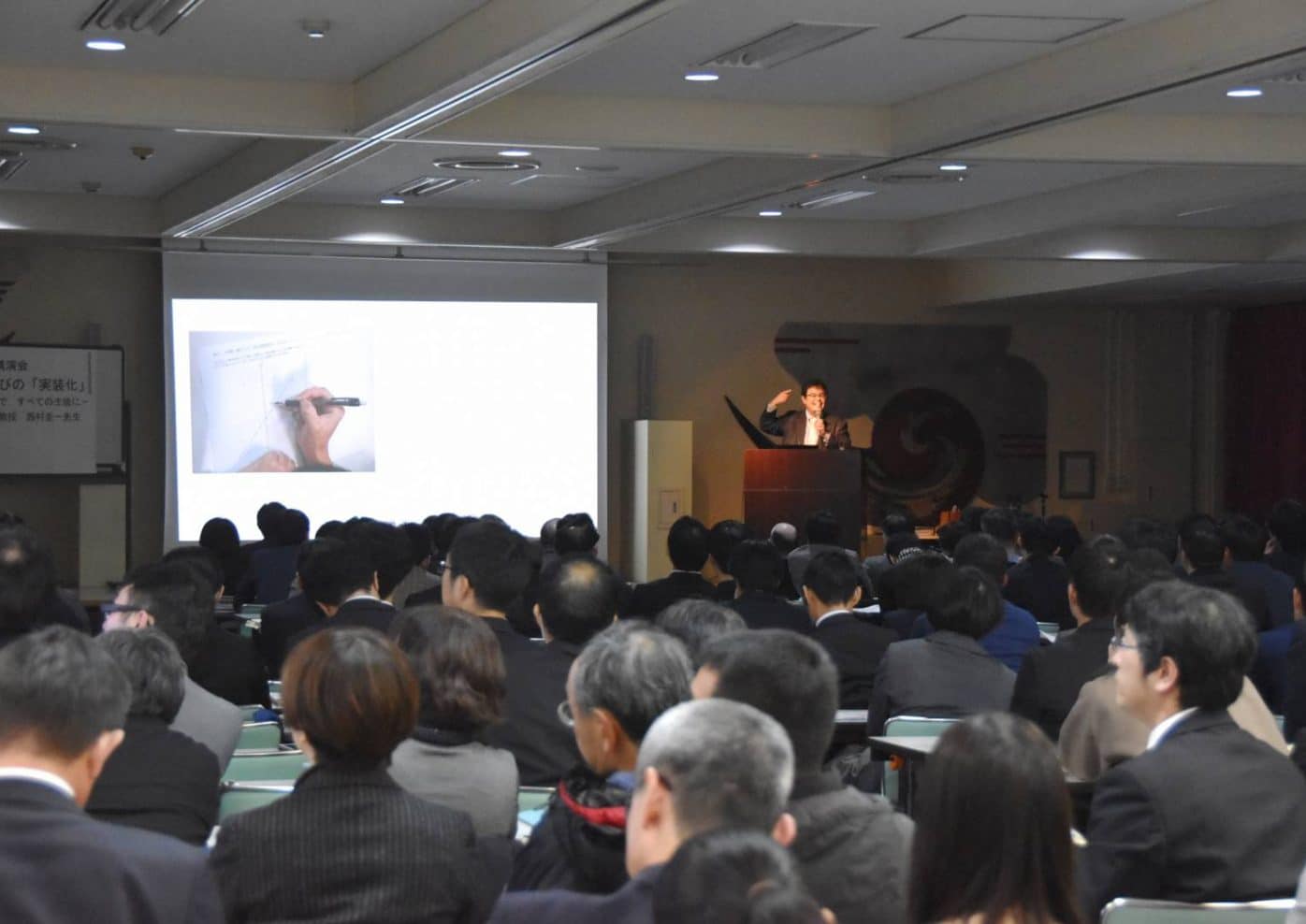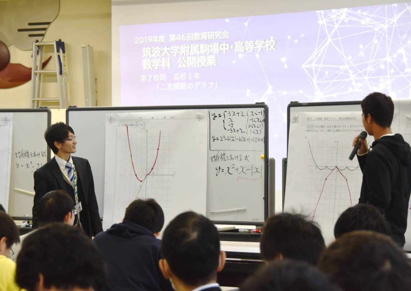 11月23日(土),本校の第46回教育研究会が行われました。今年度は国語,数学,保健体育,美術の公開授業と研究協議会が行われ,全国各地から400名を超える教育関係者の皆様にお越しいただきました。講演会では東京学芸大学の西村 圭一先生から「探究的な学びの『実装化』ーすべての学校で,すべての生徒にー」という題目で,数学教育の視点から,いかに探究的な要素を学びに取り入れていくかについて有意義なご講演をいただきました。