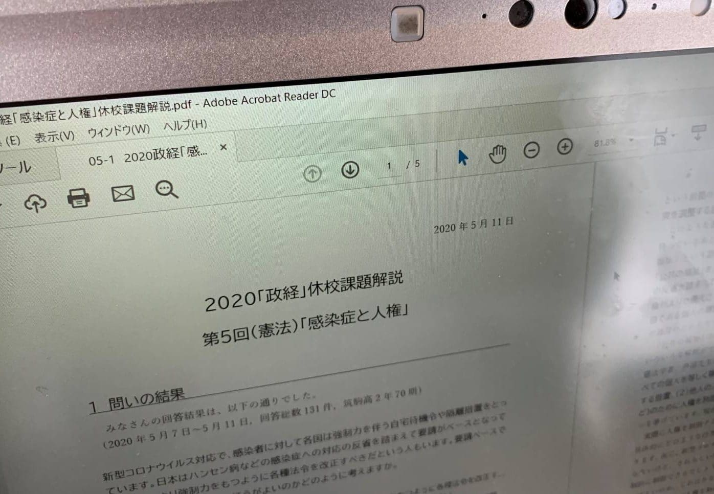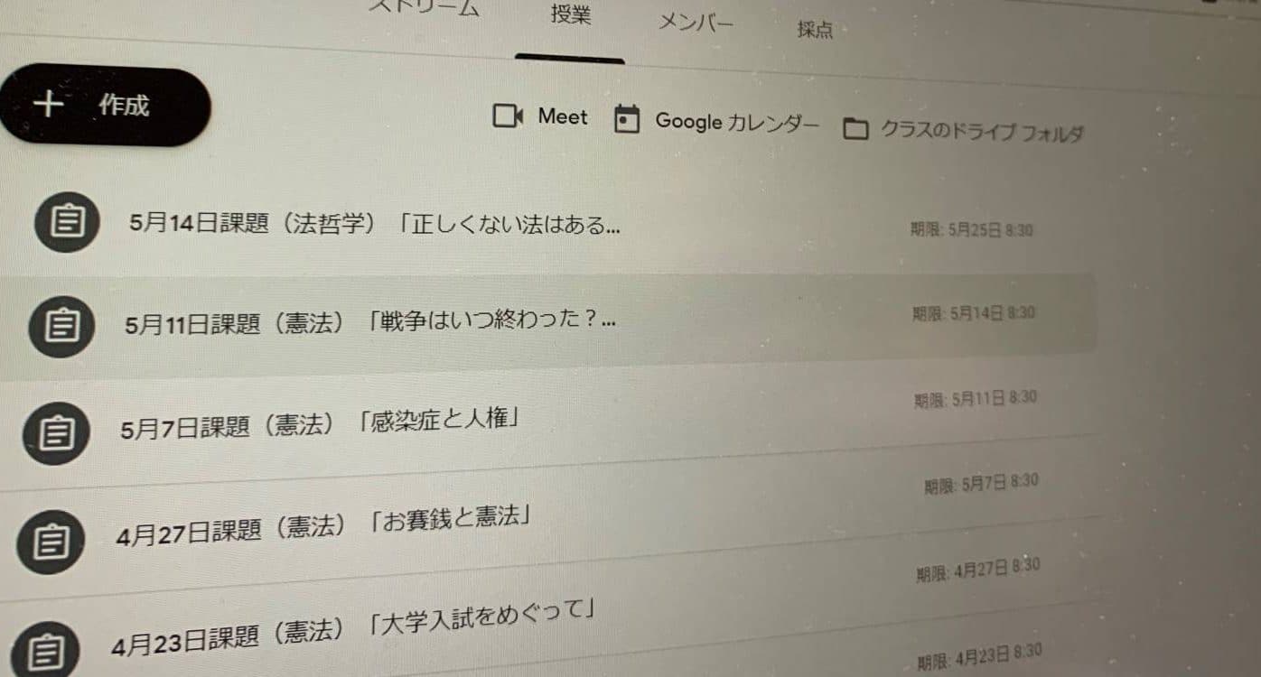 本校では、同期型のオンライン学習支援だけでなく、配信型のオンライン学習支援も行っております。 生徒にGoogleclassroomを使って課題を出し、生徒の回答に対してフィードバックをするような授業が多くみられます。 例えば、高2「政治・経済」では「感染症と人権」など今日的な課題に生徒は取り組んでいます。