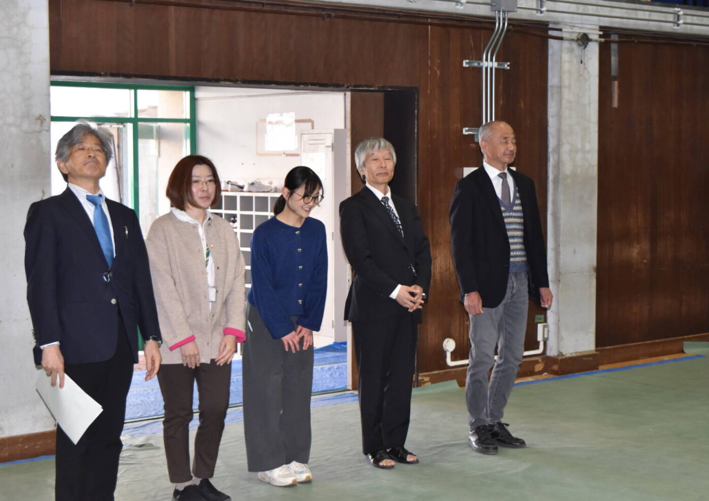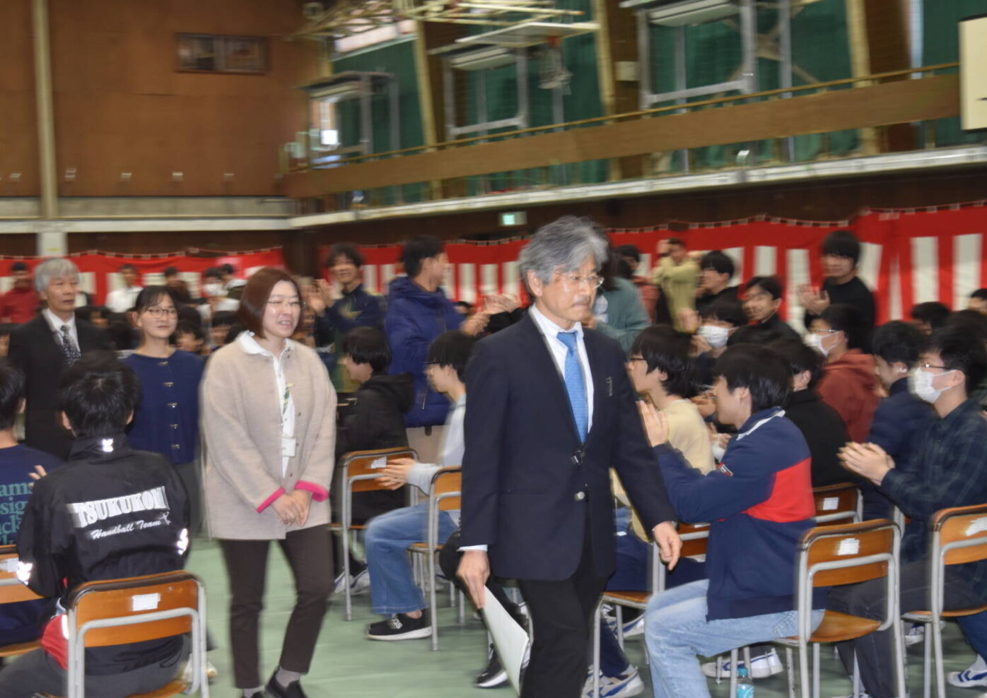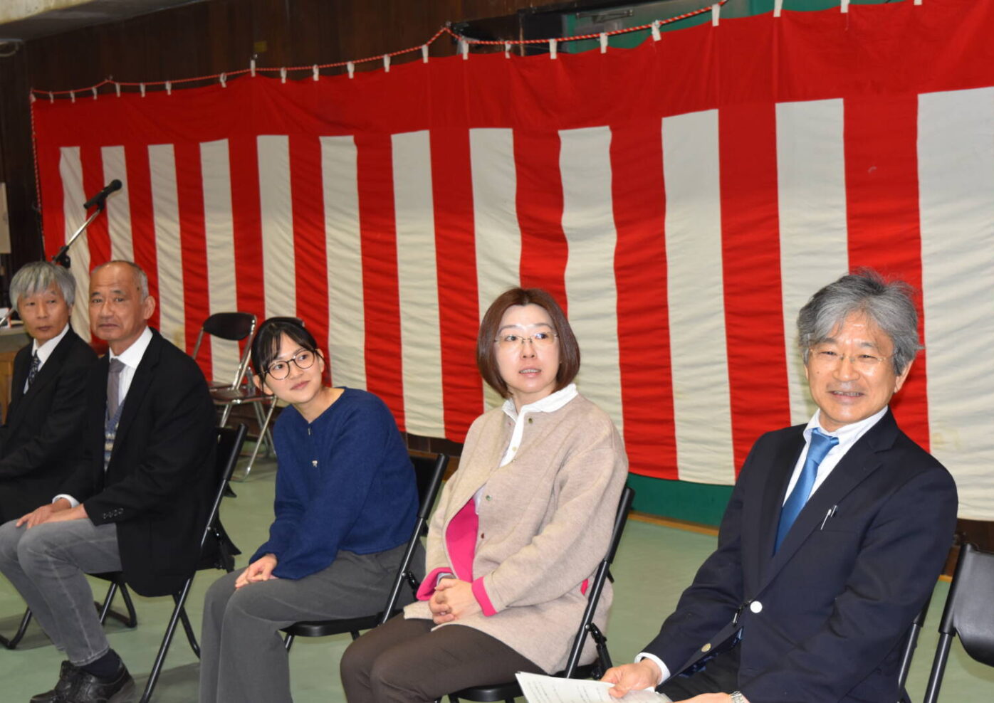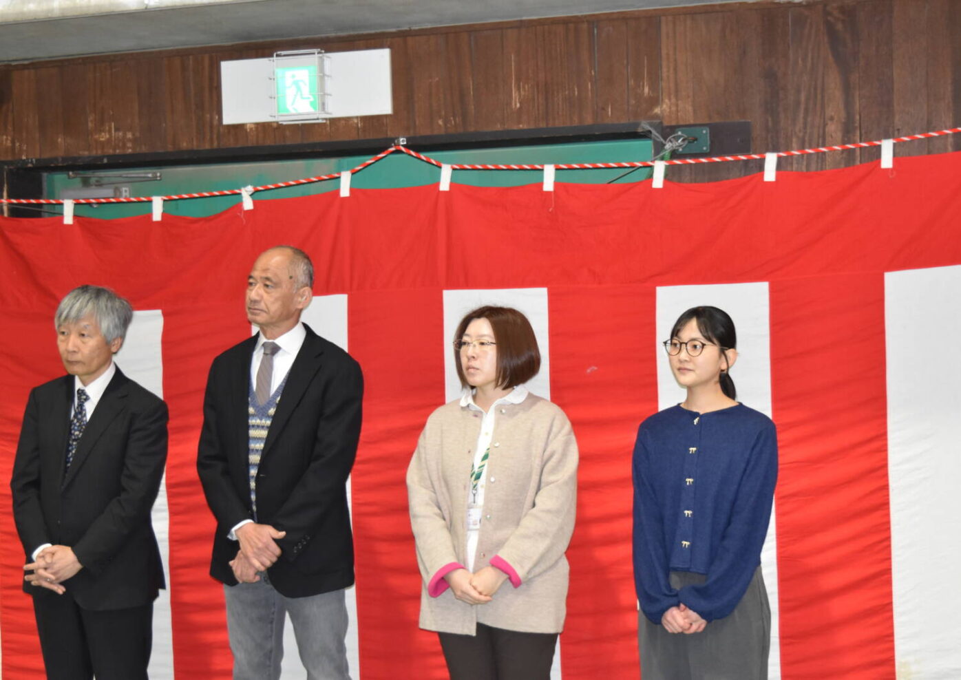 離任式では、今年度をもちまして、ご退職される 校長の北村先生、保健体育の合田先生、国語の関口(隆)先生、養護の小山先生、事務の渡辺さんのご紹介がおこなわれました。