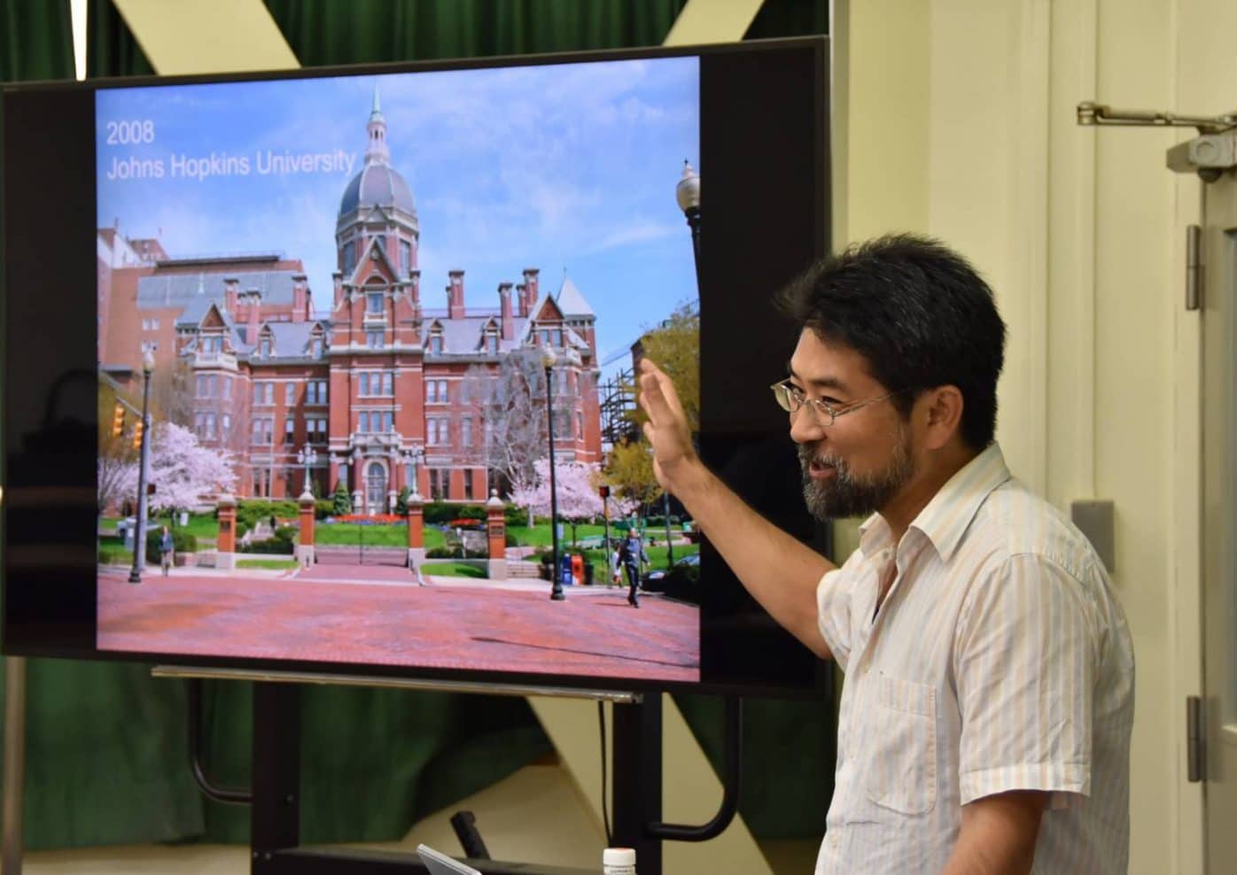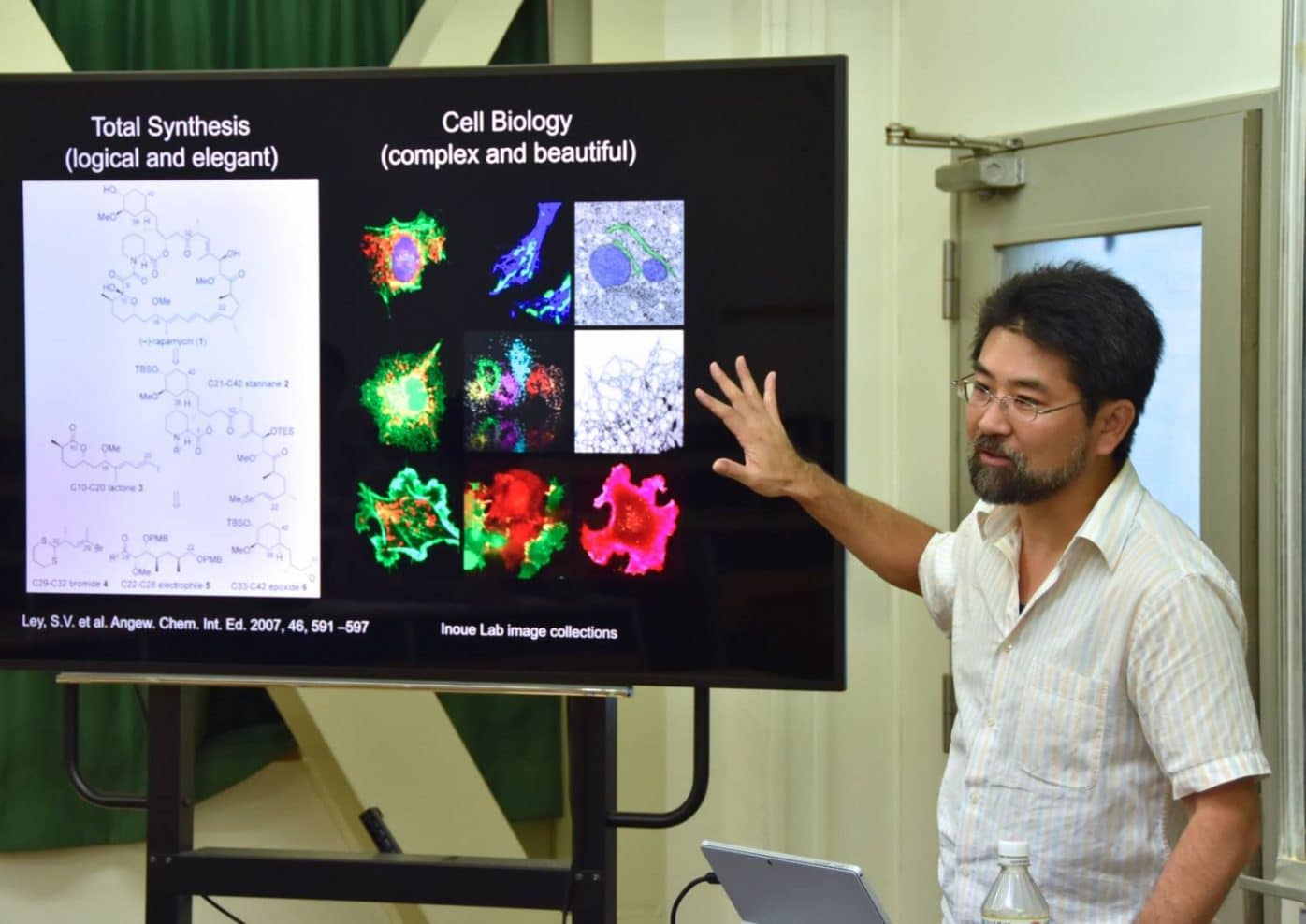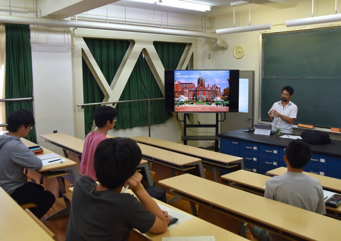 9月20日(金),本校42期OBで現在ジョンズホプキンス大学教授の井上尊生さんにお越しいただき,生物科特別講義「シン・バイオ ー生き物を「つくる」ことで理解する次世代型ライフサイエンスー」を行いました。合成生物学(Synthetic Biology)で人工細胞をつくることで細胞の機能を理解していくという研究の話や,アメリカで一人前の研究者として研究室を運営していく話など,大変興味深い内容をお話しいただきました。