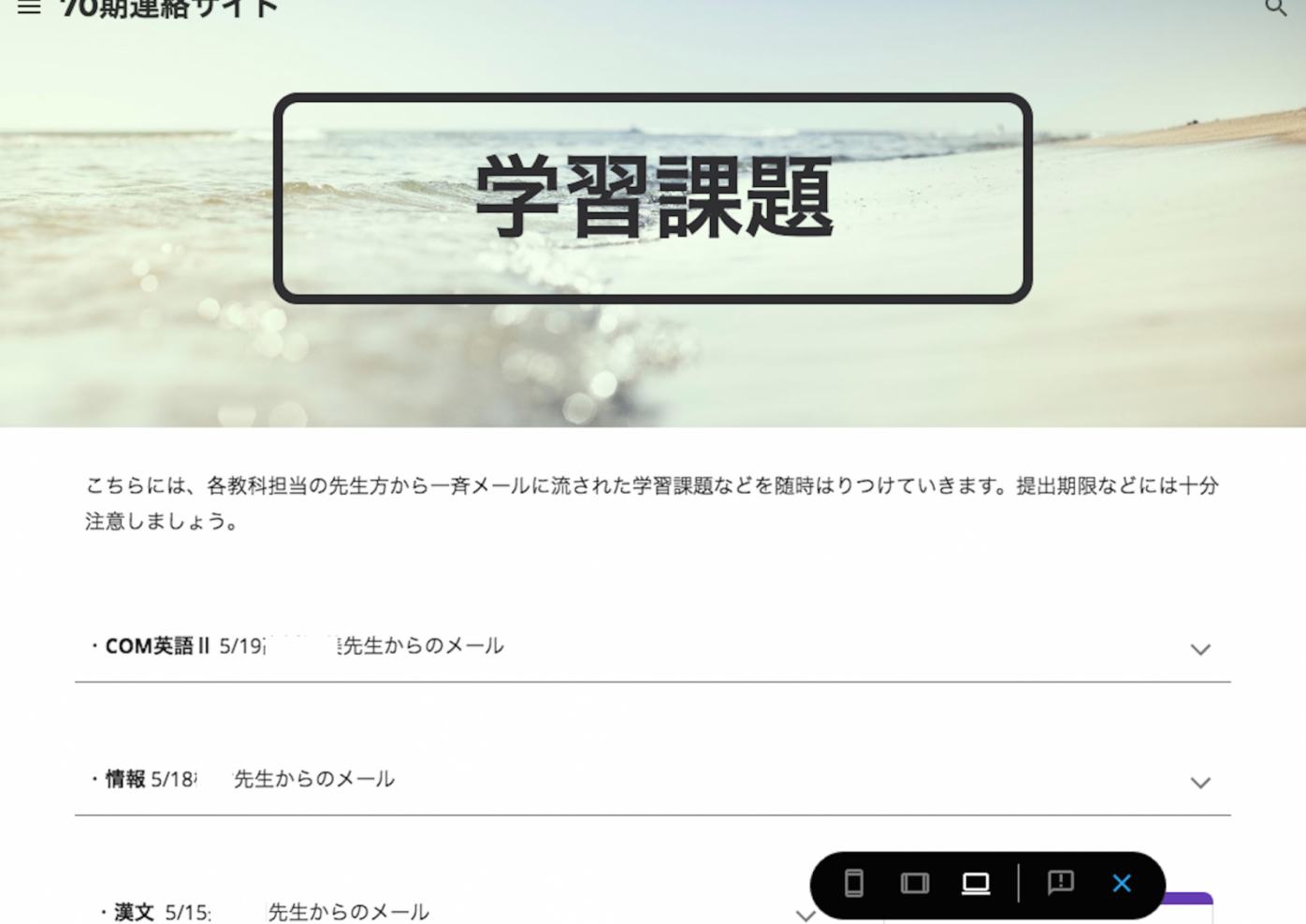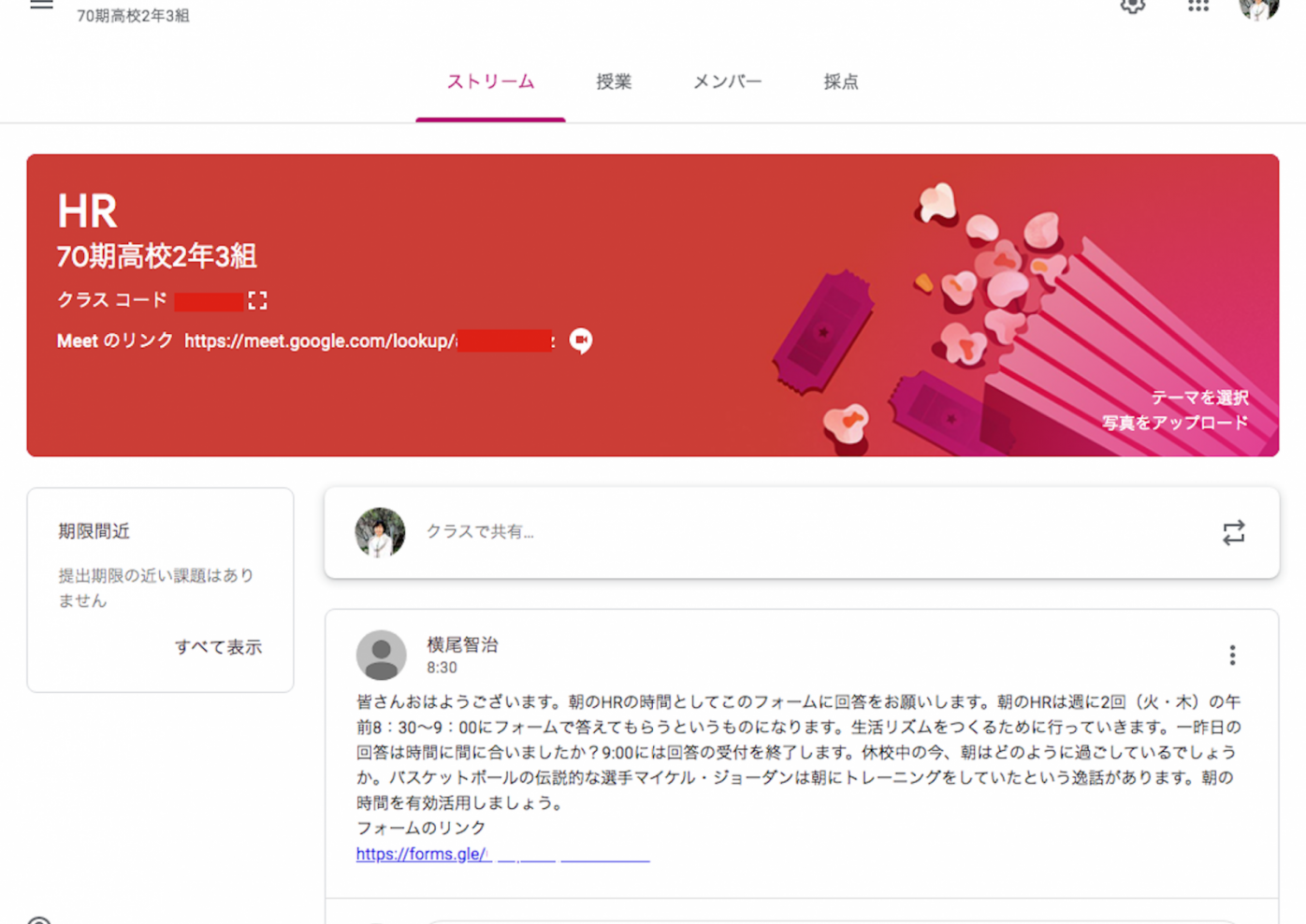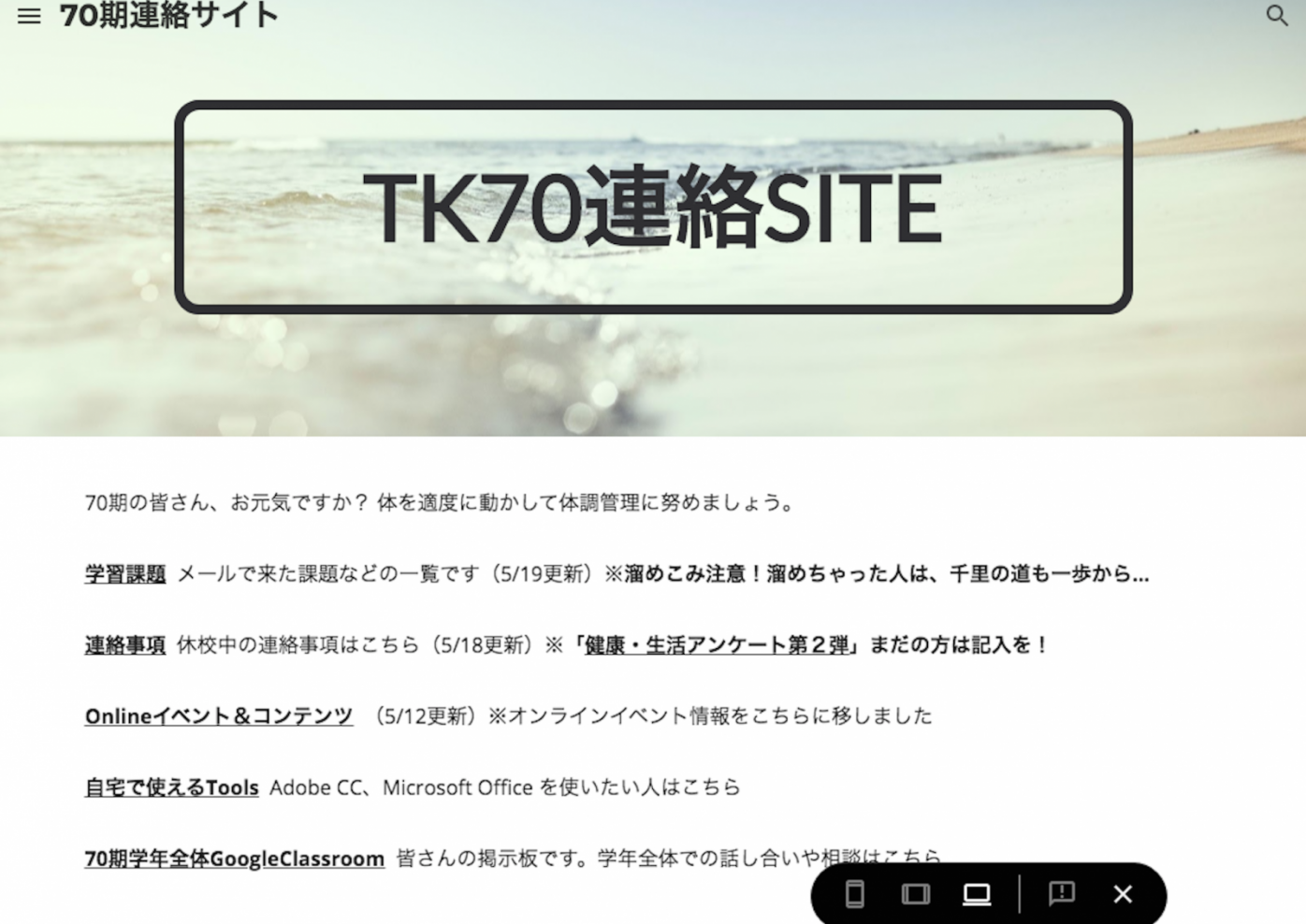 本校ではGoogleの教育システムであるGsuiteを導入しており、休校中の生徒の皆さんへの連絡にもGoogleサイトやGoogle classroomが活用されています。担任団で学年専用の連絡サイトを運用したり、GoogleFormを活用して朝のHRを行ったりしています。