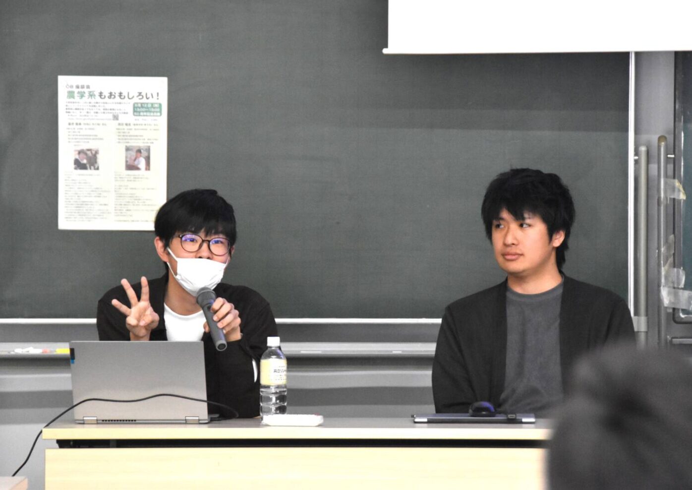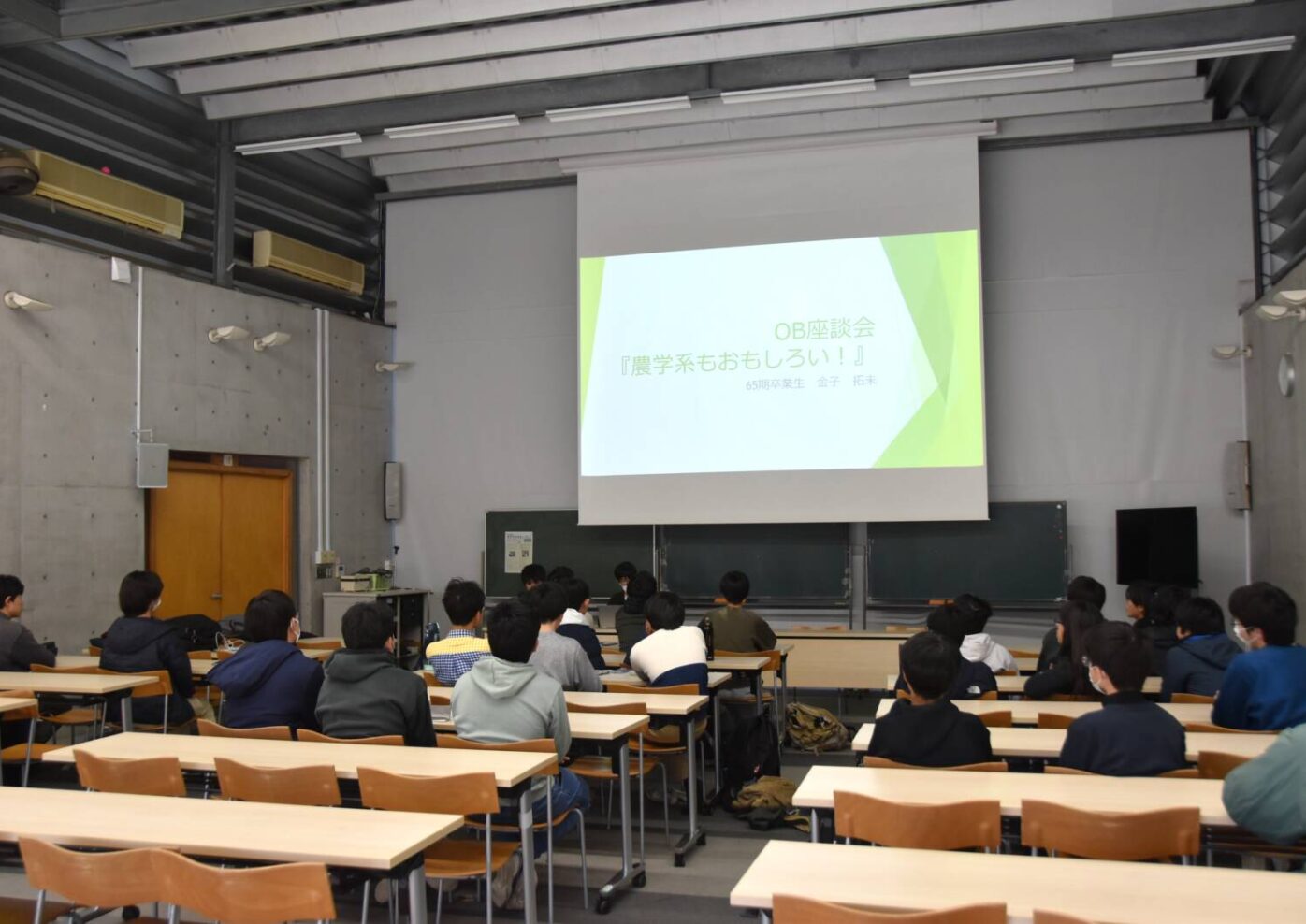 3月12日、今年の春に大学院を修了して4月から社会人になる農学系の先輩2名をお招きし、OB座談会「農学系もおもしろい!」を開催しました。中1から卒業したての高3まで計29名が参加しました。1人目は65期OB金子拓未さん。東京大学で森林科学をご専門として大学の演習林で樹木の芽生えやコケにつく微生物などをご研究されていました。2人目は68期OB天川裕太さん。東京大学で農業農村工学をご専門とし、水田の土壌や水の動態についてご研究されていました。農学と一口に言っても環境とヒトとの関わりを研究する幅広い分野であることや、何にでもぶつかってチャレンジしていくことの大切さについて熱弁してくれました。フロアからもたくさんの質問が出て、研究のみならずリアルな大学生活についてもたくさんお話いただきました。